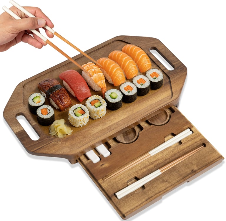 From the premium acacia wood finish to the smart hidden drawer and Sushi serving tray with handles, see every detail that makes it a perfect choice for sushi lovers, home décor, or as a thoughtful gift.
